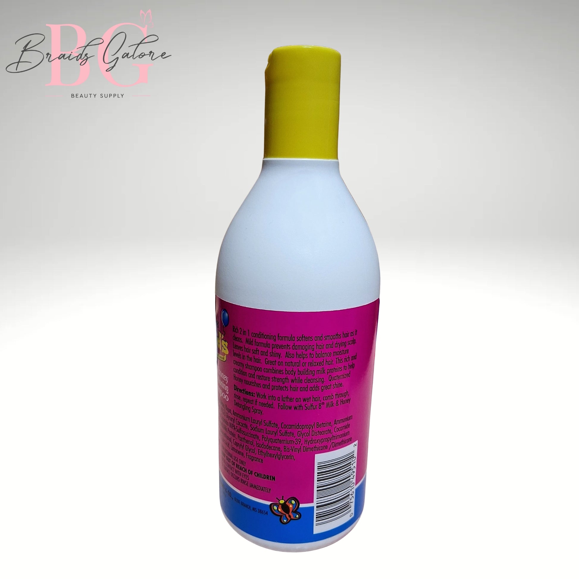 Sulfur8 Kid's is a conditioning shampoo designed to meet the needs of children ages 2-12. This rich 2-in-1 conditioning formula softens and smooth hair as it cleans. The mild formula prevents damaging hair and drying scalp. It leaves hair soft and shiny and also helps to balance moisture levels in the hair. The formula is great on natural or relaxed hair. This Rich and creamy shampoo combines bodybuilding milk proteins to help condition and restore strength while cleansing. Quatronized honey nourishes and protects hair and adds great shine. Good for all children and hair types.